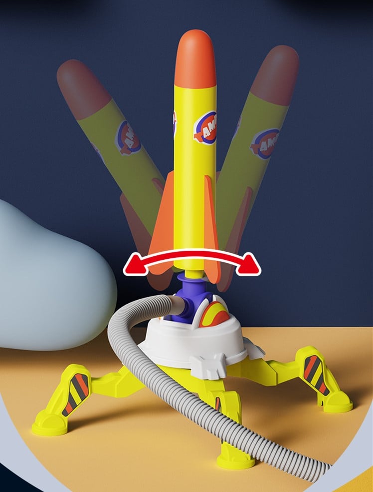Coloca el cohete en la base, pisa fuerte y mira cómo despega hacia el cielo.