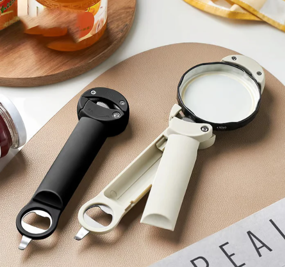 Abre frascos, botellas y latas sin esfuerzo con este abridor 4 en 1. Diseño ergonómico, fácil de usar y perfecto para tapas de distintos tamaños. ¡Ideal para cualquier cocina!