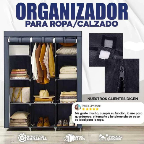 Su estructura liviana y resistente permite armarlo en minutos, sin necesidad de herramientas. Cuenta con amplios compartimentos para organizar tu ropa y accesorios, protegiéndolos del polvo y manteniéndolos siempre a la vista.