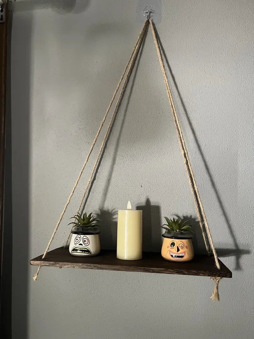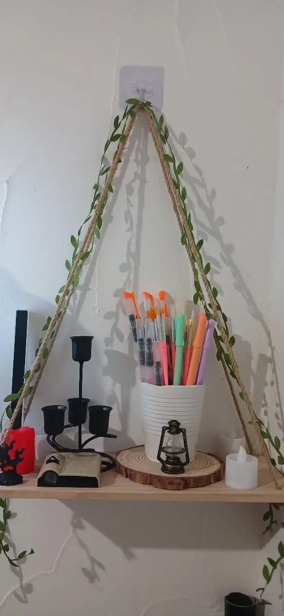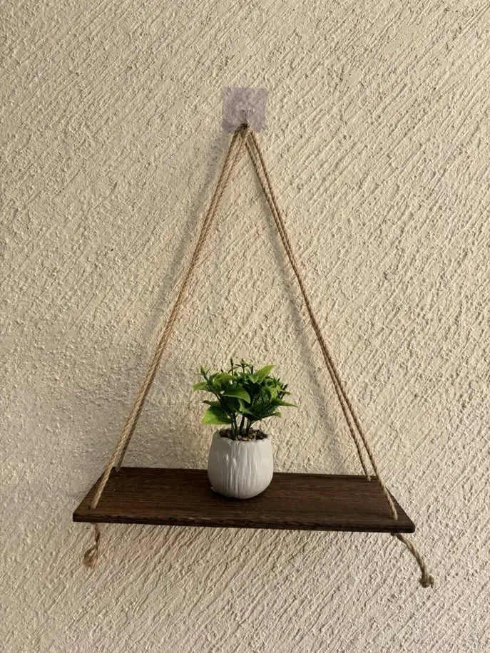 este estante flotante de madera con cuerda de cáñamo combina estilo y funcionalidad en cualquier espacio. Perfecto para exhibir plantas, libros o decoraciones, su diseño elegante y rústico añade un toque natural a cualquier habitación. fácil de instalar, es el accesorio ideal para quienes buscan una decoración sencilla y chic.