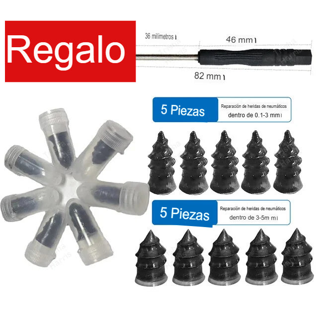 juego de pernos de caucho y metal diseñado para reparar neumáticos de forma rápida y segura. perfecto para emergencias en carretera, estos pernos ofrecen una solución confiable y duradera para pinchazos sin necesidad de desmontar el neumático.