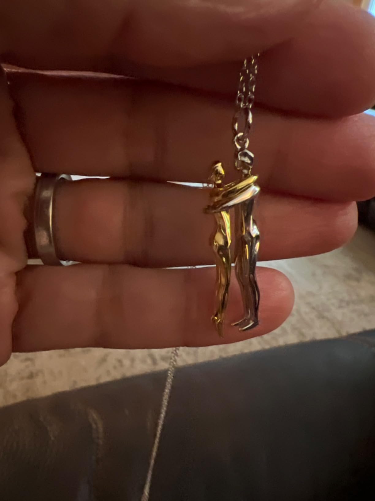 Collar para parejas en forma de abrazo, hecho de acero inoxidable de alta calidad. Un accesorio único que simboliza la unión, la fortaleza y el amor que siempre los mantendrá juntos, sin importar la distancia.
