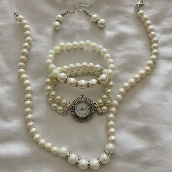 este set de joyería de perlas incluye reloj, manilla, collar y aretes, perfecto para complementar cualquier look con un toque de elegancia y distinción. sus perlas delicadas y su diseño atemporal hacen que sea ideal para ocasiones especiales o para llevar cada día con estilo.
