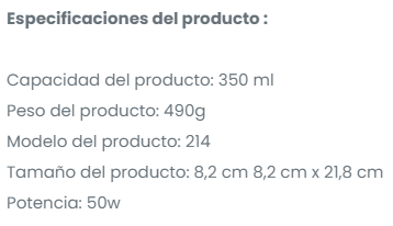 Nuestra licuadora recargable une eficiencia y estilo. Diseñada para los amantes de la vida saludable; su potente motor y cuchillas de acero inoxidable te garantizan batidos perfectos en cuestión de segundos. Su batería de larga duración y recarga rápida te aseguran energía constante para tus smoothies, jugos y más, sin importar dónde te encuentres.