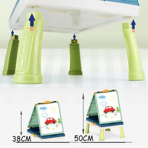 Cuenta con pizarra blanca, pizarra negra, superficie magnética y espacio para dibujo o pintura, todo en un diseño práctico, seguro y colorido.