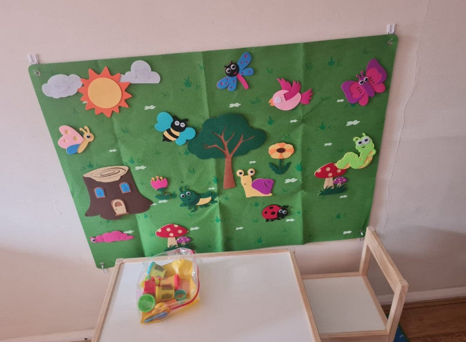 ste fondo de fieltro está diseñado para estimular las habilidades motoras y la creatividad de los niños. Con colores vibrantes y piezas removibles, permite crear diferentes escenarios y actividades.
